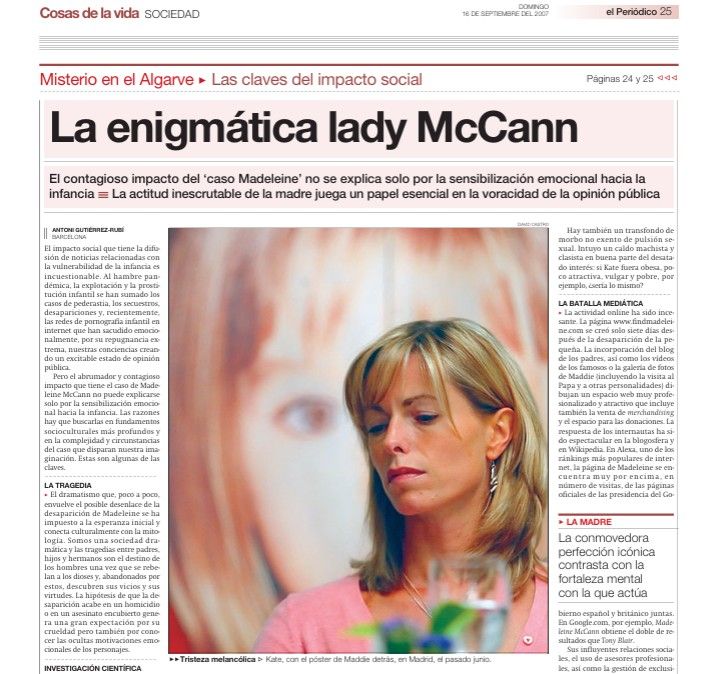 Kate y Maddie. La expresividad cautivadora y magnética de los ojos (con un iris peculiar) y del rostro de Madeleine juegan un papel esencial en la implicación emocional y en el interés mediático. Pero los auténticos protagonistas del día a día mediático son, indiscutiblemente, los padres y, en especial, la madre. Kate resulta enigmática (¿y por ello sospechosa?) y ahí radica la voracidad de la opinión pública.