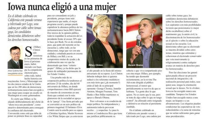 Pero las elecciones las ganará quien pueda ofrecer un proyecto nacional de integración y de realización personal para todos, sean quien sean, tengan la orientación sexual que deseen. No lo olviden: Iowa no ha escogido nunca una candidata. Tampoco los Estados Unidos han escogido nunca a una mujer, a un hispano o a un afroamericano. Las etiquetas pueden condicionar las expectativas de voto reduciéndolas a la suma de minorías que no serían suficientes para ganar unas presidenciales.