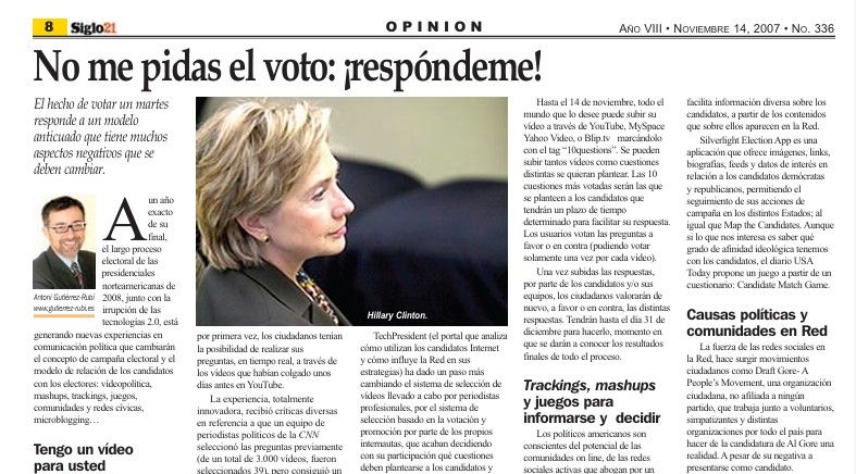 A un año exacto de su final, el largo proceso electoral de las presidenciales norteamericanas de 2008, junto con la irrupción de las tecnologías 2.0, está generando nuevas experiencias en comunicación política que cambiarán el concepto de campaña electoral y el modelo de relación de los candidatos con los electores: vídeopolítica, mashups, trackings, juegos, comunidades y redes cívicas, microblogging…
