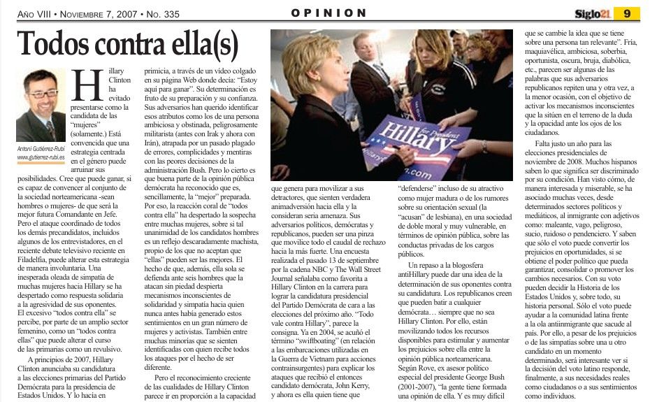 A principios de 2007, Hillary Clinton anunciaba su candidatura a las elecciones primarias del Partido Demócrata para la presidencia de Estados Unidos. Y lo hacía en primicia, a través de un vídeo colgado en su página web donde decía: «Estoy aquí para ganar». Su determinación es fruto de su preparación y de su confianza. Sus adversarios han querido identificar esos atributos como los de una persona ambiciosa y obstinada, peligrosamente militarista (antes con Irak y ahora con Irán), atrapada por un pasado plagado de errores, complicidades y mentiras con las peores decisiones de la administración Bush. Pero lo cierto es que buena parte de la opinión pública demócrata han reconocido que es, sencillamente, la «mejor» preparada. Por eso, la reacción coral de «todos contra ella» ha despertado la sospecha entre muchas mujeres, sobre si tal unanimidad de los candidatos hombres es un reflejo descaradamente machista, propio de los que no aceptan que «ellas» pueden ser las mejores. El hecho de que, además, ella sola se defienda ante seis hombres que la atacan sin piedad despierta mecanismos inconscientes de solidaridad y simpatía hacia quien nunca antes había generado estos sentimientos en un gran número de mujeres y activistas. También entre muchas minorías que se sienten identificadas con quien recibe todos los ataques por el hecho de ser diferente.