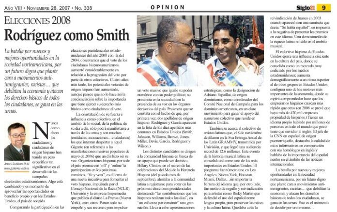 La constatación de su fuerza e influencia como colectivo, en el ámbito de lo social, de la política, de su día a día, sólo podrá manifestarse a través de las urnas y son muchos (entidades, asociaciones…ciudadanos) los que intentan despertar a aquel Gigante (en referencia a las manifestaciones masivas populares de mayo de 2006) que un día hizo oír su voz. Organizaciones hispanas por todo el país promueven off y online la participación en los próximos comicios. «Ve y vota» es el lema de una nueva iniciativa para fomentar el voto hispano, impulsada por el Consejo Nacional de la Raza (NCLR), Univisión y la empresa Impremedia que publica el diario La Prensa (Nueva York), entre otros. Ponen todo su empeño y sus recursos para impulsar un voto masivo que iguale su poder numérico con su poder político; su presencia en la sociedad con la presencia de su voz en los órganos decisorios del país. Presencia que se constata con el hecho de que, por primera vez, dos apellidos de origen hispano: Rodríguez y García aparecen en la lista de los diez apellidos más comunes en Estados Unidos (Smith, Johnson, Williams, Brown, Jones, Miller, Davis, García, Rodríguez y Wilson).