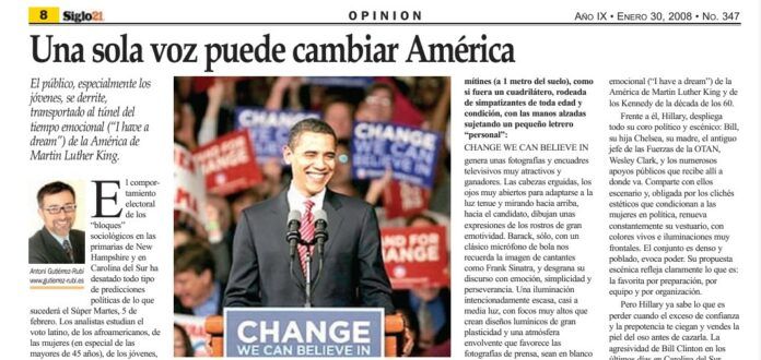 Esta estética casi mística, de fuerte liderazgo persuasivo, refuerza su mensaje: «Una sola voz puede cambiar a un grupo, un grupo puede cambiar a una ciudad, una ciudad puede cambiar un Estado y, en última instancia, una sola voz puede cambiar América». Y el público, especialmente los jóvenes, se derrite, transportado al túnel del tiempo emocional (I have a dream) de la América de Martin Luther King y de los Kennedy de la década de los 60 (precisamente, Caroline Kennedy, hija del presidente JFK y su tío Ted Kennedy han hecho público su apoyo a la candidatura de Obama. «Necesitamos un cambio en el liderazgo de este país, tal como lo tuvimos en 1960. Por primera vez, creo haber encontrado al hombre que podría inspirarnos como lo hizo mi padre, y no sólo a mí, sino también a toda una generación de norteamericanos», dijo Caroline Kennedy recientemente a The New York Times).