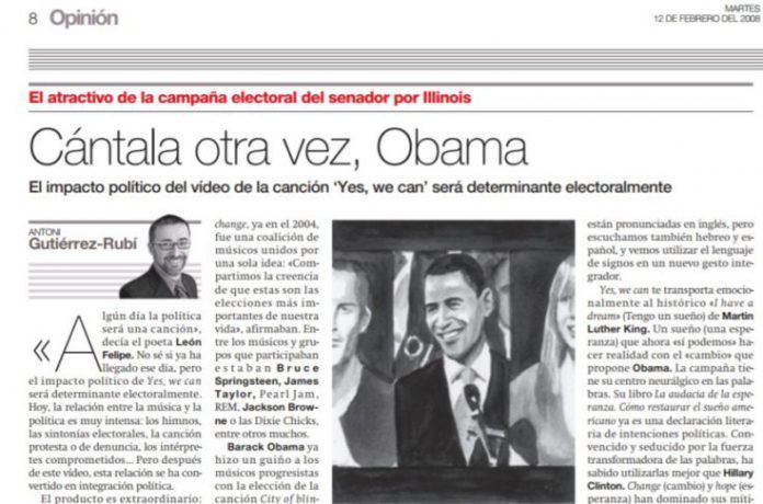 «Algún día la política será una canción», decía el poeta León Felipe. No sé si ya ha llegado ese día, pero el impacto político de «Yes, We Can» será determinante electoralmente. Hoy, la relación entre la música y la política es muy intensa: los himnos, las sintonías electorales, la canción protesta o de denuncia, los intérpretes comprometidos… Pero después de este vídeo, esta relación se ha convertido en integración política.