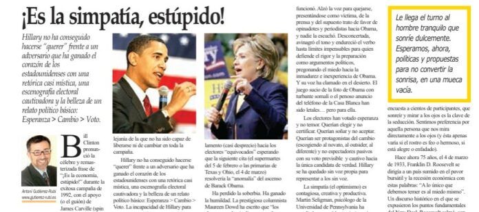 Bill Clinton pronunció la célebre y remasterizada frase de «¡Es la economía, estúpido!» durante la exitosa campaña de 1992, con el apoyo (o el guion) de James Carville (spin doctor). Dieciséis años más tarde, la economía y la ideología han dejado paso, parcialmente, a la simpatía y a las emociones políticas. Si Hillary arroja, definitivamente, la toalla en los próximos días se habrá demostrado que todos sus argumentos de ser la candidata más preparada, experimentada, decidida y la favorita durante mucho tiempo en su propio partido, en Washington y en los medios de comunicación, se habrán estrellado con la imagen de frialdad y lejanía de la que no ha sido capaz de liberarse ni de cambiar en toda la campaña.