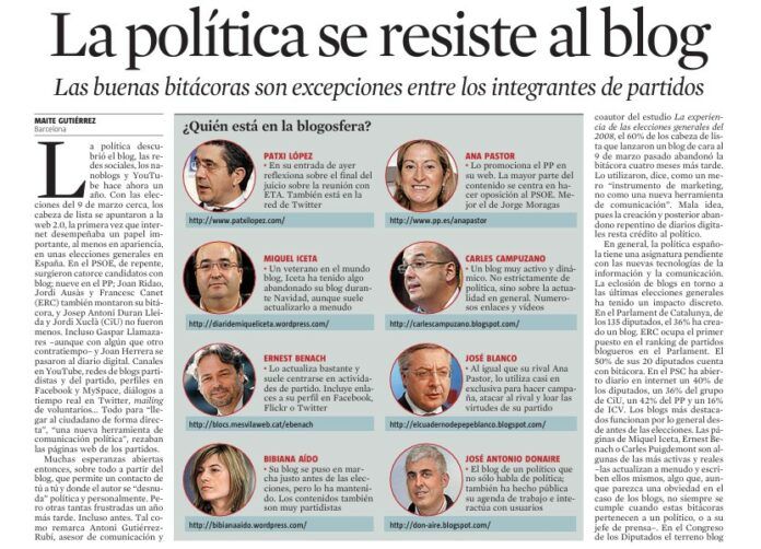 (…)«Tal como remarca Antoni Gutiérrez-Rubí, asesor de comunicación y coautor del estudio La experiencia de las elecciones generales del 2008, el 60% de los cabeza de lista que lanzaron un blog de cara al 9 de marzo pasado abandonó la bitácora cuatro meses más tarde. Lo utilizaron, dice, como un mero ‘instrumento de marketing, no como una nueva herramienta de comunicación’. Mala idea, pues la creación y posterior abandono repentino de diarios digitales resta crédito al político».(…)