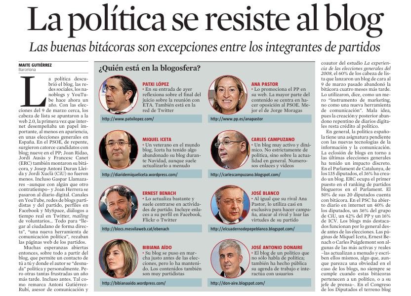 Hoy en La Vanguardia "La política se resiste al blog" de Maite Gutiérrez. Me entrevistó para hacer el reportaje: http://tinyurl.com/78c4bu