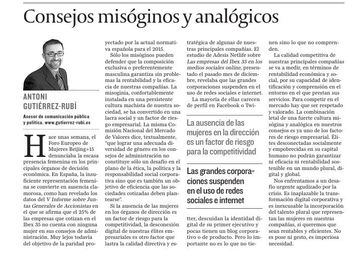 […] Antonio Gutierrez Rubí realiza unas buenas reflexiones sobre la composición de los consejos de administración y porqué se encuentran distribuciones sexistas dentro de las direcciones de empresa. […]