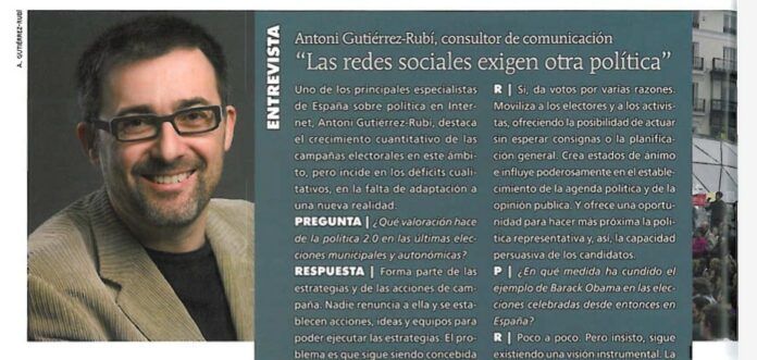 Uno de los principales especialistas de España sobre política en Internet, Antoni Gutiérrez-Rubí, destaca el crecimiento cuantitativo de las campañas electorales en este ámbito, pero incide en los déficits cualitativos, en la falta de adaptación a una nueva realidad.
