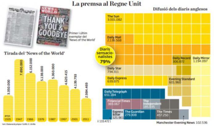 L’escàndol del News of the World ha posat contra les cordes la premsa groga i alguns dels dubtosos —o directament il·legals— mètodes que fa servir per aconseguir històries. Però una major consciència de la seva toxicitat no implica necessàriament una disminució del seu abast: l’any 2001, el 79 % de la premsa que es difonia al Regne Unit era sensacionalista. Deu anys més tard, el percentatge es manté inalterat: pràcticament quatre de cada cinc diaris venuts corresponen als anomenats tabloides, que exploten el vessant més morbós de la notícia. Més encara: les dues úniques capçaleres que han crescut en aquests deu anys són The Daily Star i The Evening Standard, tots dos sensacionalistes.