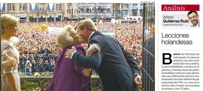 Beatriz de Holanda ha culminado 33 años de reinado con una transición discreta y sobria. La previsibilidad y cautela en el proceso, y buenas dosis de profesionalidad y mesura, han permitido una abdicación serena y normalizada con unos índices de popularidad del 70 %. La reina de la sonrisa cede el trono, sin traumas ni excesos, a sus 75 años.