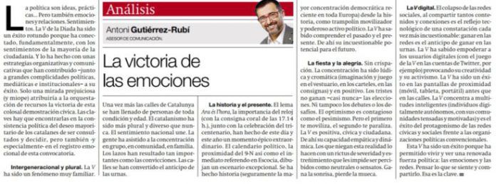 La política son ideas, prácticas… pero también emociones y relaciones. Sentimientos. La V de la Diada ha sido un éxito rotundo porque ha conectado, fundamentalmente, con los sentimientos de la mayoría de la ciudadanía. Y lo ha hecho con unas estrategias organizativas y comunicativas que han contribuido ─junto a grandes complicidades políticas, mediáticas e institucionales─ a su éxito. Solo una mirada prejuiciosa (y miope) atribuiría a la orquestación de recursos la victoria de esta colosal demostración cívica. Las claves hay que encontrarlas en la consistencia política del deseo mayoritario de los catalanes de ser consultados y decidir, pero también ─y especialmente─ en el registro emocional de esta convocatoria.