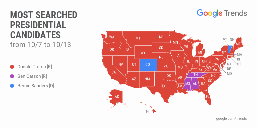 - Por lo general utilizan vídeos cortos que desarrollan gráficos lineales, donde con «y» representan distintas variables y «x» el tiempo de búsqueda, para exponer qué buscaron los electores. Como el vídeo sobre los temas más buscados durante el debate republicano, o el que muestra quiénes fueron los candidatos más buscados durante el debate demócrata.