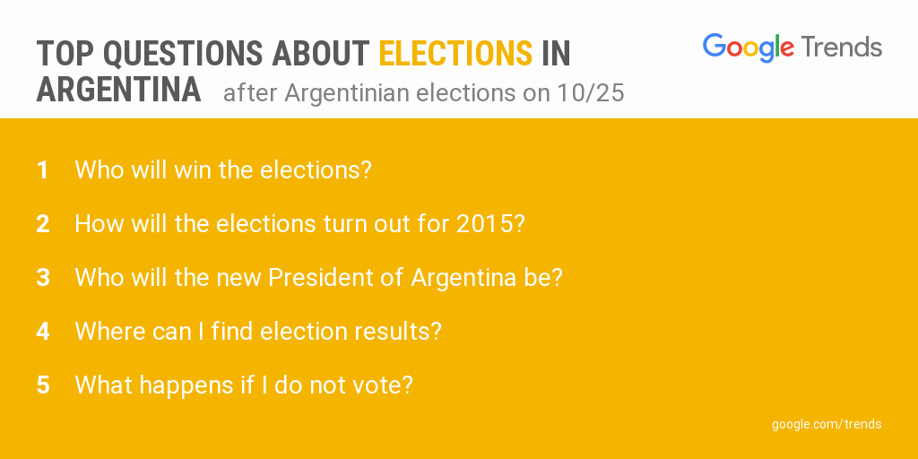 Durante la reciente campaña por la presidencia argentina, tal como se puede ver en los gráficos de Google Trends, los tres principales candidatos mantuvieron una calma paridad hasta la última semana, momento en el que Mauricio Macri se vio beneficiado por dos picos de búsquedas que sobresalen triplicando y duplicando la cantidad de búsquedas de sus rivales. El primer pico se dio en el último domingo de campaña, día en que los principales medios argentinos publicaron sus últimas encuestas (las cuales mostraban una amplia diferencia a favor de Daniel Scioli) y el segundo en el día de cierre de campaña, cuando la estrategia de Macri para dicho día se centró en las redes sociales. Estas oleadas pudieron ser decisivas ―al considerarse que las encuestas mostraban un 13 % de indecisos― y favorecer a Macri, quien sin resultar ganador, forzó una segunda vuelta que lo deja con grandes chances de hacerse con la presidencia.