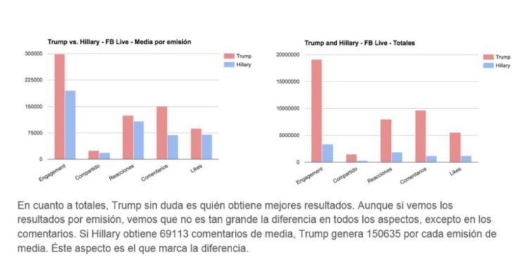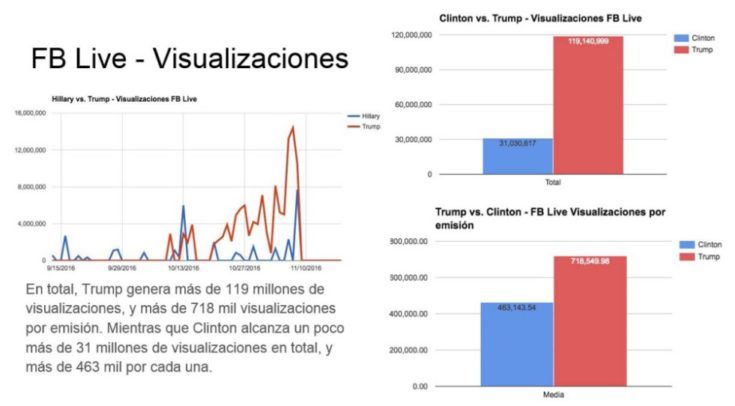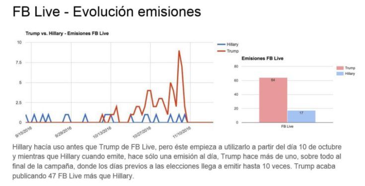 Los directos de Trump lograron una audiencia de 119 millones de visualizaciones mientras que los de Clinton de 31 millones pese a que la demócrata ya hacía uso de Facebook Live en septiembre y el republicano no empezó hasta octubre. Trump fue más activo en los días decisivos: llegó a emitir 10 directos diarios en la antesala de los comicios, mientras que Clinton solo uno. Y eso se tradujo en el número de comentarios que propiciaron esas emisiones: 70.000 de media para Clinton por directo y 150.000 para Trump.