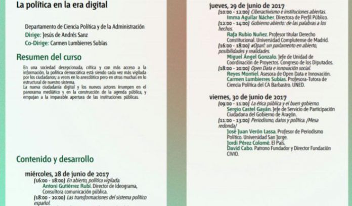 Del 28 de junio al 30 de junio de 2017 tendrá lugar en Barbastro el Curso de verano «La política en la era digital«, impulsado por la UNED Barbastro. El director es Jesús de Andrés Sanz, y codirige Carmen Lumbierres Subías, con la colaboración de Imma Aguilar.