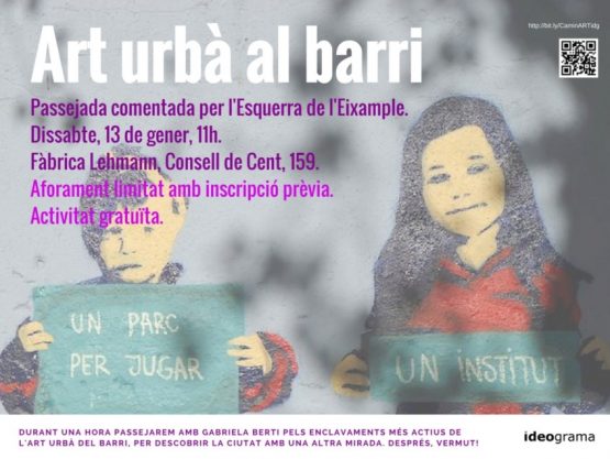 Durante una hora pasearemos por los enclaves más activos del arte urbano del Eixample izquierdo, para descubrir la ciudad con otra mirada. Al finalizar la visita compartiremos un vermut poniendo sobre la mesa olivas y conversaciones amenas en nuestro espacio de la Fàbrica Lehmann. (Actividad coordinada por Gabriela Berti. Más en: Arte urbano y ecología. Caminata comentada por el Eixample izquierdo)