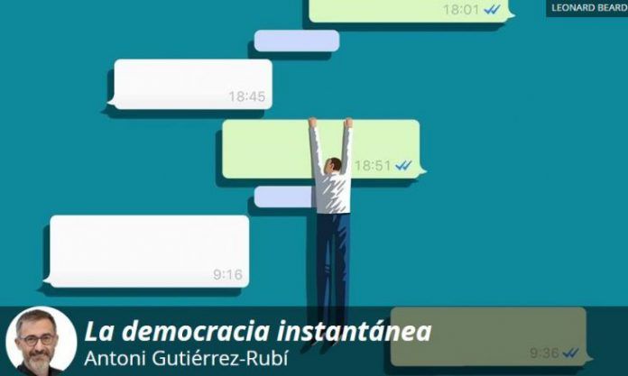 5. Lo táctico se impone sobre cualquier otra disciplina. Deberíamos pensar a medio y largo plazo para no cometer errores. En cambio, la democracia instantánea nos lleva al imperio de lo táctico. Hay una clara dependencia de la inmediatez. Líderes que ya no se reúnen, sino que hablan ―y gobiernan― por WhatsApp. No hay capacidad de reflexión, la estamos perdiendo, la pierden los líderes. Y todo ello tiene como consecuencia una mayor debilidad de la política.