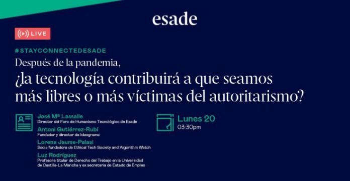 Mañana, 20 de abril, participo en el webinar: «Después de la pandemia, la tecnología contribuirá a que seamos más libres o más víctimas del autoritarismo?», organizado por ESADE (@ESADE) a través de su Foro de Humanismo Tecnológico, dirigido por José María Lassalle, un espacio de «reflexión, conocimiento y debate público en torno al impacto de la tecnología». Intervendrán también Lorena Jaume-Palasi (@lopalasi) y Luz Rodríguez (@rodriguezluz_).