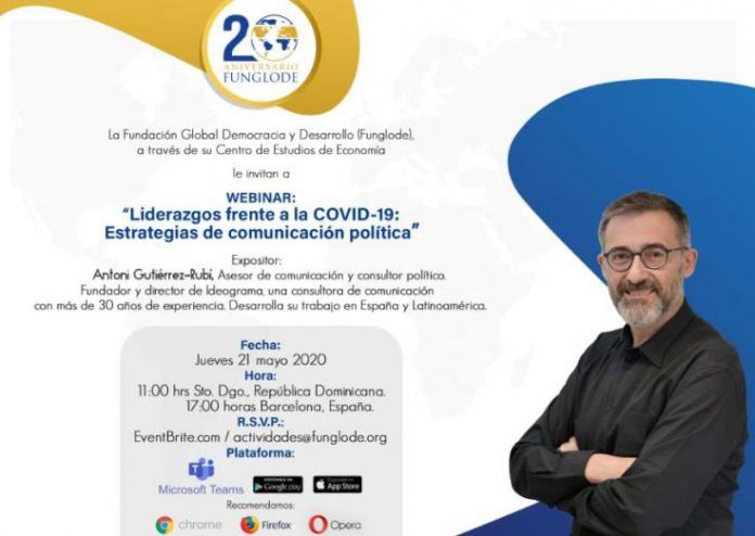 El próximo jueves, 21 de mayo, tengo el placer de participar en este webinar, organizado por la Fundación Global Democracia y Desarrollo (FUNGLODE), a través de su Centro de Estudios de Economía. Hablaré sobre: «Liderazgos frente a la COVID-19: Estrategias de comunicación política». El evento tendrá lugar a las 11h am (República Dominicana), 17h (España). Para asistir es necesario inscribirse previamente a través de Eventbrite. La sesión se emitirá a través de la plataforma Microsoft Teams y podrá seguirse en Twitter con la etiqueta #LiderazgosCOVID.