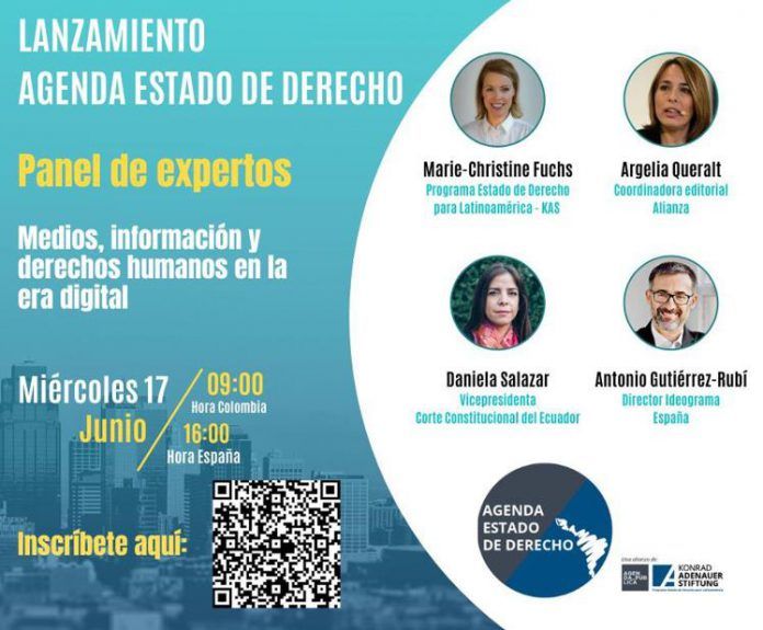 El evento de lanzamiento de la alianza que se celebra esta tarde a las 16h. (hora de España), 9h. (hora de Colombia) se plantea como un espacio de conversación conducido por las dos coordinadoras de la iniciativa: Argelia Queralt (coordinadora editorial del nuevo proyecto Agenda Estado de Derecho) y Marie-Christine Fuchs (Directora del Programa de Estado de Derecho de la Fundación Konrad Adenauer) y en el que participaremos Daniela Salazar (Jueza de la Corte Constitucional de Ecuador) y un servidor, para dialogar especialmente sobre la importancia de plataformas informativas, como Agenda Estado de Derecho, para la comunicación en materia de Estado de Derecho y de Derechos Humanos y su impacto para la comunidad latinoamericana, entre otros temas, reflexionando sobre los desafíos del intercambio y acceso informativo en materia jurídio-política entre Latinoamérica y Europa, así como de la necesidad de compatibilizar los ejercicios del derecho a través de medios de comunicación digitales.