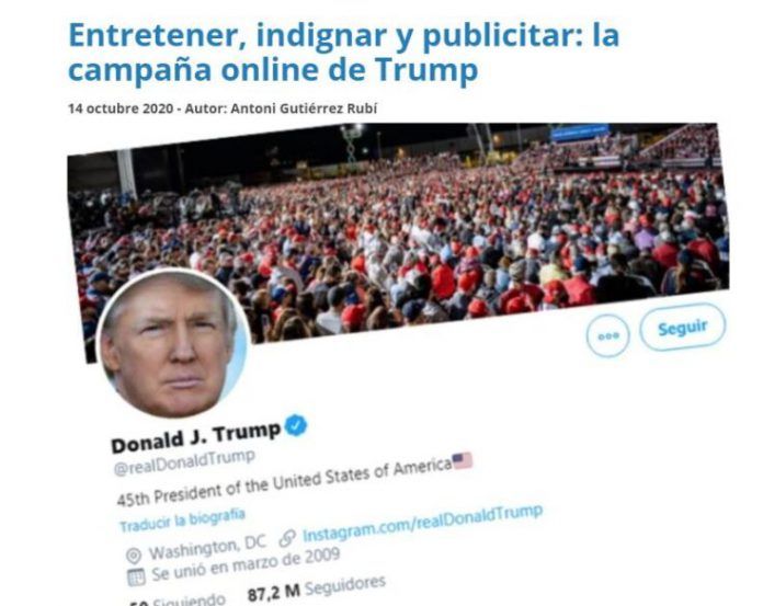 Las redes fueron una gran arma para Trump en 2016, y lo continúan siendo en 2020. Se sigue entreteniendo (de hecho, con el directo constante como arma electoral), se sigue indignando (logrando más y más difusión en redes y prensa) y se sigue publicitando. Veremos si los resultados son los mismos que hace cuatro años, o si esta vez no es suficiente.