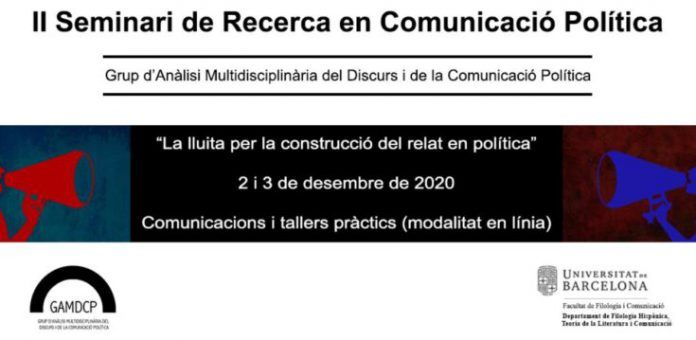 Dimecres, 2 de desembre, tinc el plaer de desenvolupar la conferència inaugural online del II Seminari de Recerca en Comunicació Política – La lluita per la construcció del relat en política, organitzat pel Grup d’Anàlisi Multidisciplinària del Discurs i de la Comunicació Política i la Facultat de Filologia i Comunicació de la Universitat de Barcelona.