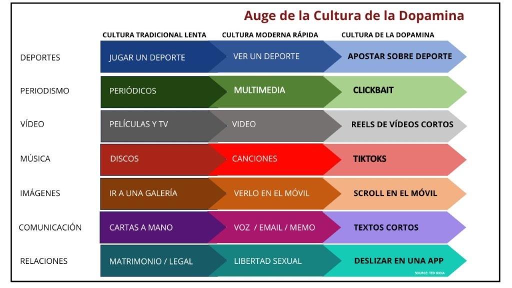 El crítico de jazz e historiador musical estadounidense Ted Gioia, en su polémico artículo titulado The State of the Culture, 2024, habla de «cultura de la dopamina», donde alerta que la cultura ha sido sustituida por la distracción y proclama que el entretenimiento como lo entendíamos ha muerto.