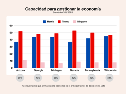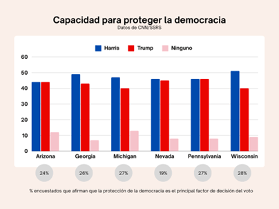 Pera hay algo curioso: los republicanos han logrado que Trump sea vea como el más capacitado para gestionar la economía. Pero, que Harris protege la democracia mejor que su adversario, no genera tanto consenso.