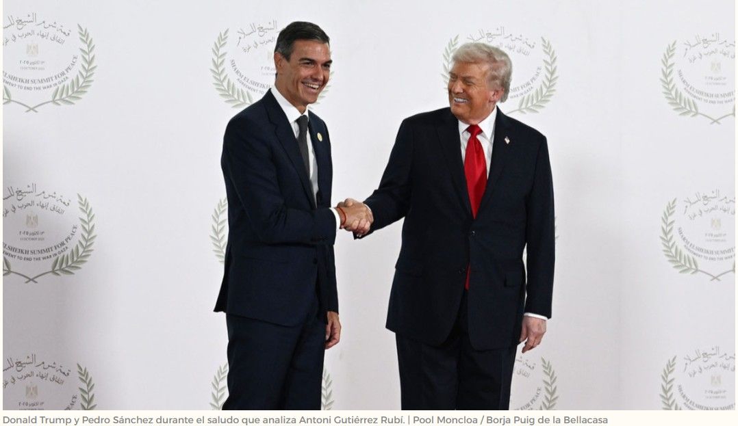 La cumbre en Egipto sobre el plan de paz ha dejado un momento único y muy comunicativo. «Trump ha reinventado la tradicional y aburrida foto política de la encajada de manos», escribe el consultor en comunicación política Antoni Gutiérrez-Rubí. El autor, que además es presidente del Consejo Asesor Internacional de ‘Agenda Pública’, afirma que Pedro Sánchez era consciente de los protocolarios saludos de Trump, por eso aguantó el envite y «los dos líderes quedaron en una suerte de empate simbólico».