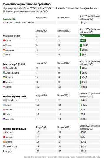 La inmigración se transformó en uno de los temas clave en las elecciones presidenciales de 2024. Entre los hombres cobraba especial relevancia: un 42% de ellos lo posicionaban como uno de los tres principales problemas del país, por encima del 36% de las mujeres. Por eso, la presidencia de Trump ha hecho hincapié en mostrar la fiereza con la que se trata a los inmigrantes en el momento de deportarlos. Además, en los presupuestos para el año 2026 han aumentado de manera importante los recursos del Servicio de Inmigración y Control de Aduanas (ICE), el cual se ha convertido en una especie de milicia personal del Gobierno, según algunos expertos. El presupuesto de esta agencia en 2026 será de 27.700 millones de dólares. Solo los ejércitos de 16 países gestionaron más dinero en 2024.