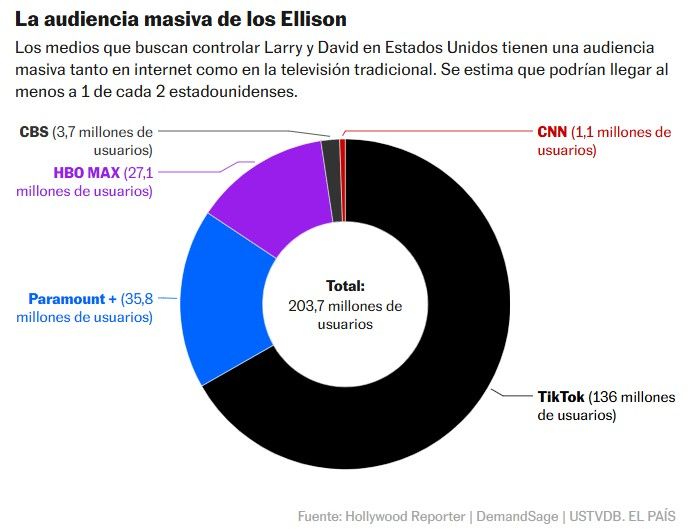 Larry Ellison, cofundador de la empresa Oracle, es el sexto hombre más rico del mundo, según el último ranking de Forbes. Su hijo es David Ellison, director ejecutivo de Paramount Skydance y una figura con poder creciente en los medios de comunicación. Ambos están aprovechando su cercanía a Trump y al Partido Republicano para construir un poderoso imperio de medios que serviría para posicionar el mensaje MAGA en diversas plataformas. El padre pagó 14.000 millones de dólares para hacerse con el control de TikTok en Estados Unidos, a la vez que el hijo ha iniciado una ofensiva para adquirir CBS y Warner, que controla CNN y que aceptó una oferta de compra después de que Netflix retirara la suya, tras una visita de su CEO a la Casa Blanca. Esta transacción aún debe ser aprobada por las autoridades regulatorias, pero no parece que le vayan a poner trabas.