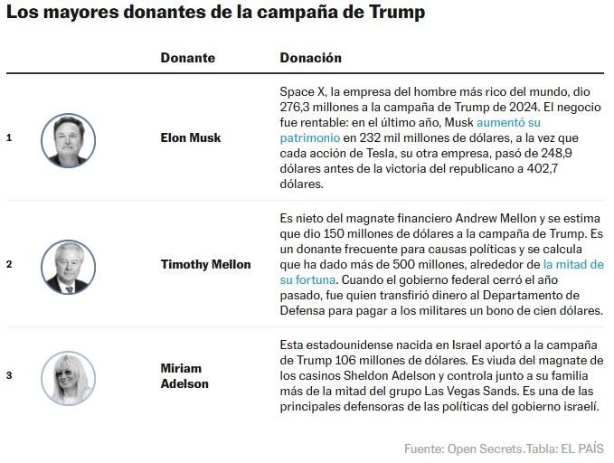 En campaña electoral, Trump ya fue el candidato más apoyado por las grandes fortunas. Pero desde que llegó a la Casa Blanca, su poder recaudatorio entre las élites ha seguido aumentando de manera importante y se estima que ha recibido 2.000 millones de dólares para diversos proyectos, tanto partidistas como institucionales. Según un estudio de NBC, una buena cantidad de los donantes que más dinero le han dado en el último año nunca habían hecho donaciones políticas, o al menos no en cantidades tan considerables. Muchos de ellos tienen intereses concretos por contratos con el Gobierno federal o porque sus empresas podrían ser vulnerables ante la regulación pública. Por ejemplo, destaca la aparición en la lista de Greg Brockman, presidente de Open AI, que dio 12,5 millones de dólares, y de Alexader Karp, el CEO de Palantir, tecnológica que utiliza la inteligencia artificial en el análisis de macrodatos. Uno de los proyectos que más recaudación ha generado es la reforma de la Casa Blanca. Ya han aportado recursos 37 donantes, entre ellos varias tecnológicas, bancos, magnates de criptomonedas y empresas del mundo de las apuestas y del juego.