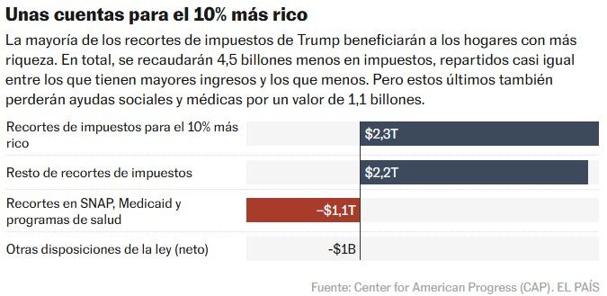 The Big Beautiful Bill, como llamó Trump a su ley de presupuestos el año pasado, incluyó algunos de los recortes de impuestos más grandes de la historia de Estados Unidos. Los hogares con más ingresos son los principales beneficiados, según un análisis del Congressional Budget Office y del Joint Committee on Taxation. Se estima que el 10% de ciudadanos más ricos se ahorrarán anualmente un promedio de 14.700 dólares, a la vez que el 1% más rico recibirá un alivio de más de 50.000 dólares al año. La ley reduce los impuestos al patrimonio, a diferentes sectores empresariales, a las transacciones internacionales de muchas compañías y disminuye el porcentaje de tributos a pagar por los más ricos.