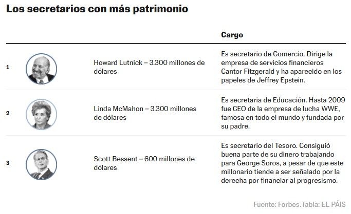 De acuerdo con una estimación de Forbes, el gabinete actual de Donald Trump es el que acumula entre sus miembros la mayor riqueza de toda la historia de Estados Unidos. Dos secretarios superan los 1.000 millones de dólares de patrimonio y tres, los 100. Entre todos, suman más de 7.500 millones de dólares, el doble que el primer equipo de Trump y alrededor de 68 veces más que la suma de todo el gabinete de Joe Biden. El presidente, que se calcula que en 2026 ha aumentado su patrimonio hasta los 7.300 millones, tiene casi tanto dinero como todos sus ministros juntos.