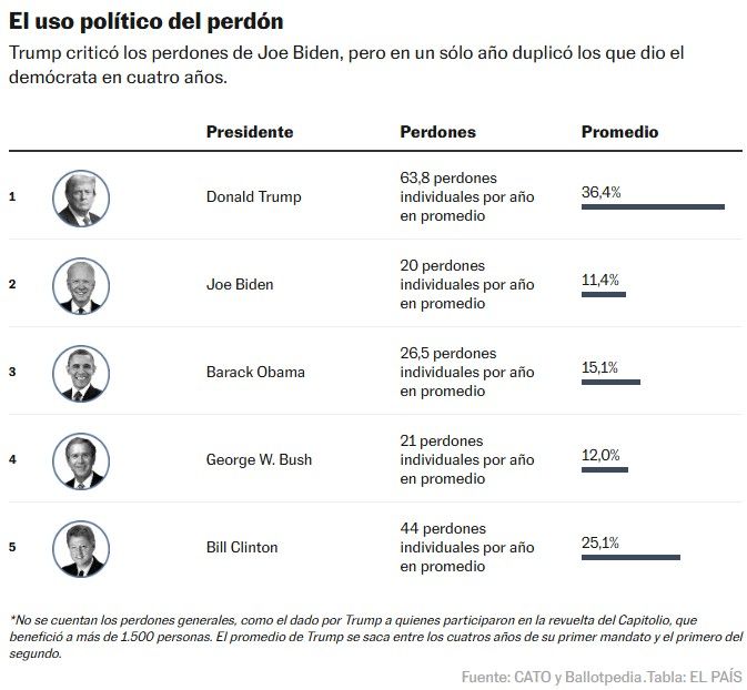 Además de las órdenes ejecutivas, Trump también ha roto récords por utilizar indiscriminadamente otro poder que tiene a su disposición como presidente: el otorgamiento de perdones. Gracias a ello, ha podido beneficiar a muchos millonarios con los cuales él o su familia han hecho negocios. Resalta el ejemplo de Changpeng Zhao, un directivo de una empresa de criptomonedas que fue liberado poco después de que Trump llegara a la Casa Blanca tras conseguir inversiones por 2.000 millones de dólares para World Liberty Financial, el negocio de criptomonedas de los hijos del presidente. En muchos casos, los perdones eximen a estos millonarios de pagar cuentas pendientes con el fisco e indemnizaciones a las víctimas de sus delitos. Según un cálculo del gobernador de California, cerca de 2.000 millones de dólares no llegarán a sus destinatarios legítimos por esta razón.